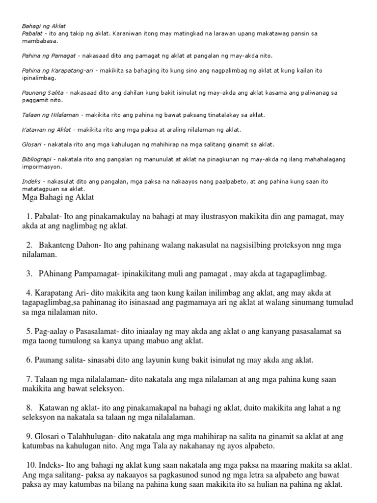 Pabalat akdakatawantalahulugan nilalamanMga Bahagi ng Aklat1.